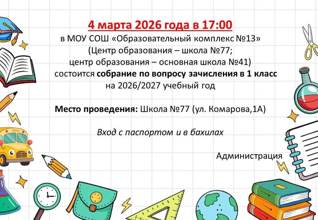 Собрание пройдёт 19 февраля, в 9:00 по адресу: улица Комарова, дом 1А (центр образования — школа № 77).