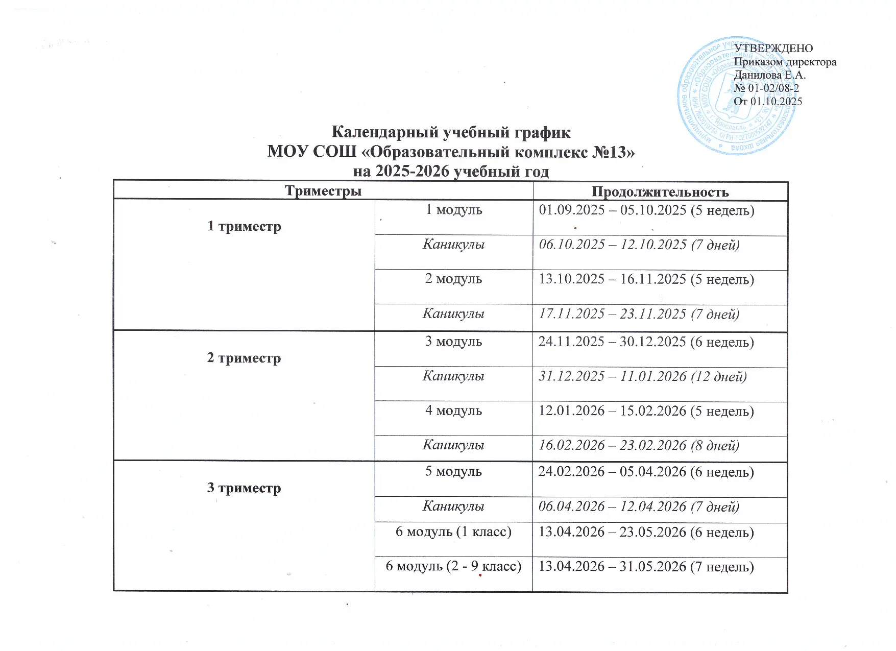 Продолжительность учебного года: 1 классы - 33 учебные недели; 2-11 классы - 34 учебные недели. 1 триместр - 10 учебных недель, 2 триместр – 11 учебных недель, 3 триместр - 13/12 учебных недель.